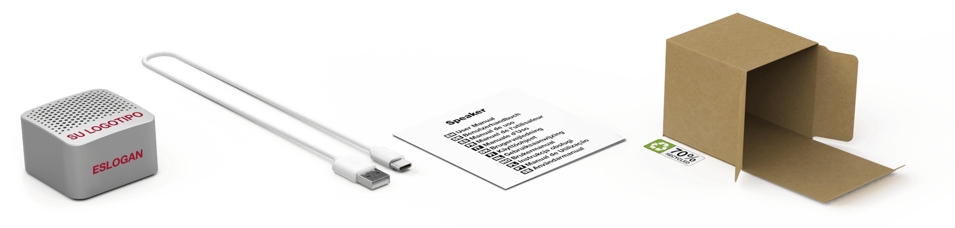 El nombre Bluetooth® es lo que el usuario ve en su dispositivo smarphone o tableta al conectarlo con su producto de Audio. Podemos personalizar este texto con su nombre de marca, dando a su organización una mayor exposición. Si no desea este servicio, el nombre predeterminado que se asignará a su producto de audio será 'Promo Audio'.Accesorios