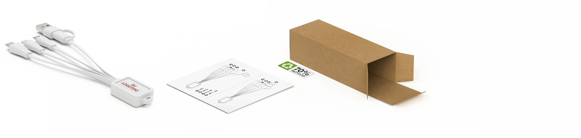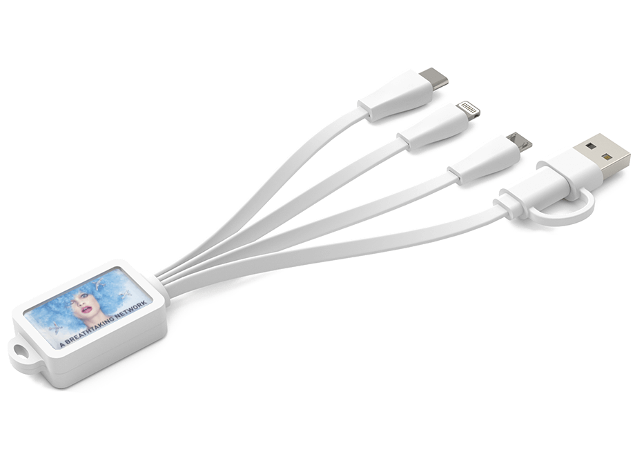 El Multi combina 4 cables en 1 práctico y fácil de transportar modelo. Tus clientes pueden enchufar el conector USB estándar en una fuente de corriente y cargar hasta 3 dispositivos con el adaptador Lighting (iphone), el USB Micro C y el USB Micro B. El Multi se puede enganchar en el llavero y cuenta con una bonita superficie para personalizar con tu imagen, logotipo, web, dirección y eslogan sin límite de colores. Para un toque de madera, echa un vistazo a nuestro modelo .