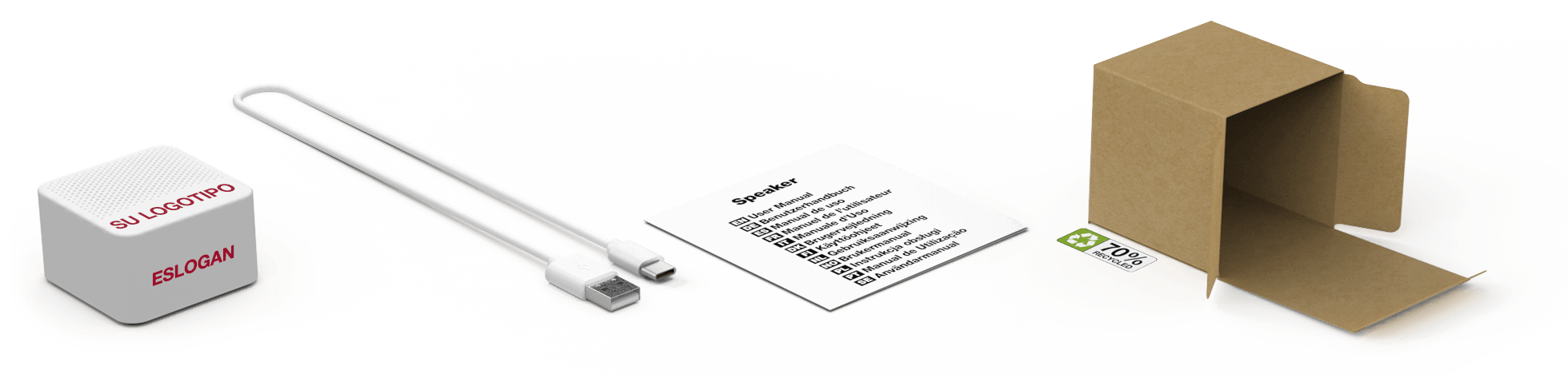 El nombre Bluetooth® es lo que el usuario ve en su dispositivo smarphone o tableta al conectarlo con su producto de Audio. Podemos personalizar este texto con su nombre de marca, dando a su organización una mayor exposición. Si no desea este servicio, el nombre predeterminado que se asignará a su producto de audio será 'Promo Audio'.Accesorios