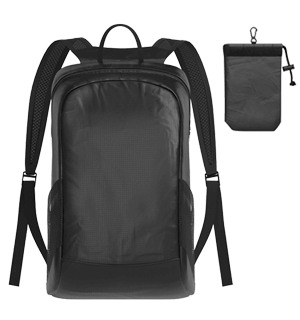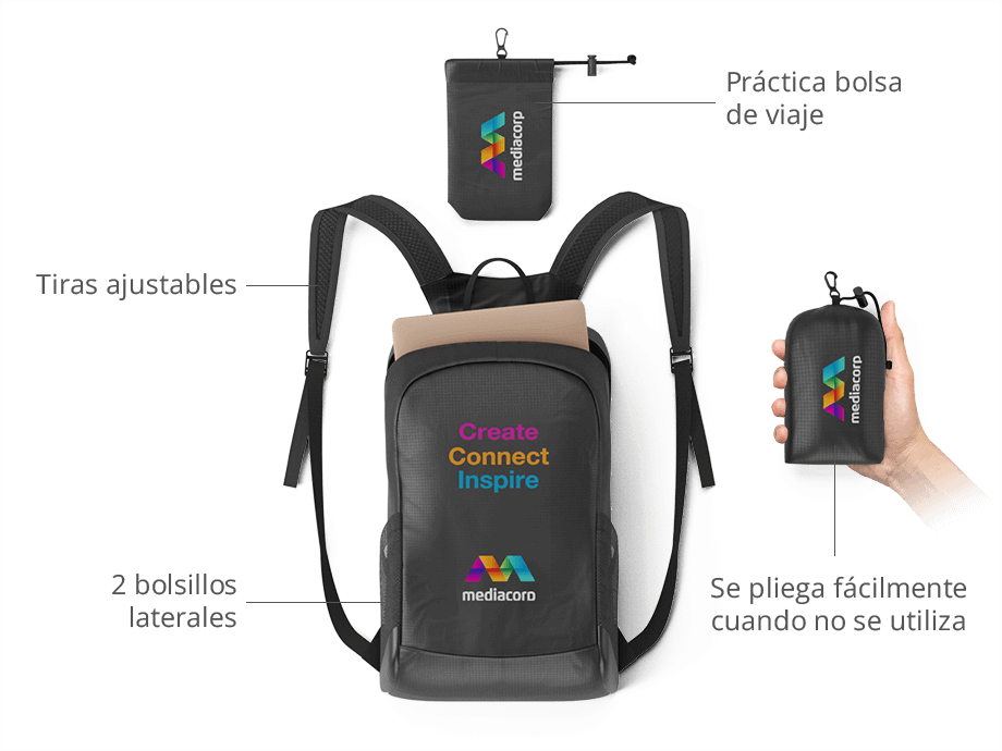 Fabricada en poliéster resistente, esta ligera mochila tiene un práctico diseño plegable que permite guardarla fácilmente en su propia bolsa cuando no se utiliza. Esto la convierte en un compañero de viaje ideal para sus clientes y empleados, tanto si se desplazan al trabajo como si disfrutan de una excursión de fin de semana.