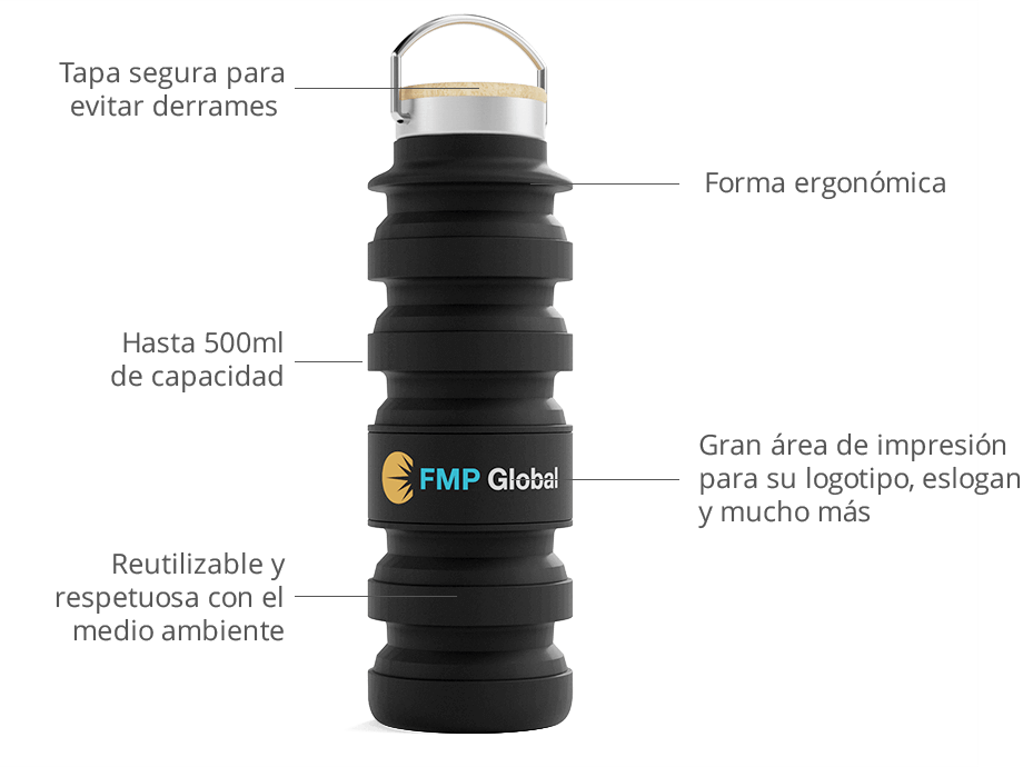 Te presentamos la botella de agua plegable Flexi, ¡el artículo promocional perfecto para tu marca! Como artículo esencial para la vida diaria, esta botella de agua flexible seguro que mantendrá su marca en la mente de clientes potenciales y partes interesadas por igual. Podemos serigrafiar, fotograbar o grabar con láser el logotipo o eslogan que elija en el cuerpo de la botella sin BPA. Con un área generosa e imperdible para la marca, mostraremos con precisión su diseño en alta resolución y colores vibrantes.