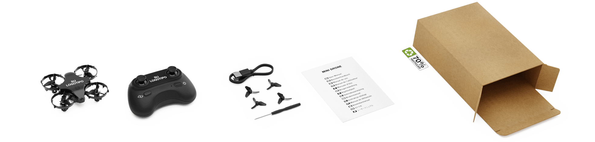 Cuenta con una sencilla función de despegue y aterrizaje con un solo toque, mientras que el protector de la hélice mejora la seguridad y protege las mini hélices. La función automática de evitación de obstáculos hace que jugar con el modo sin cabeza y la función de giro de 360° sea divertido y seguro para sus destinatarios o como demostración en su stand de feria. Nota: este mini dron no cuenta con cámara.