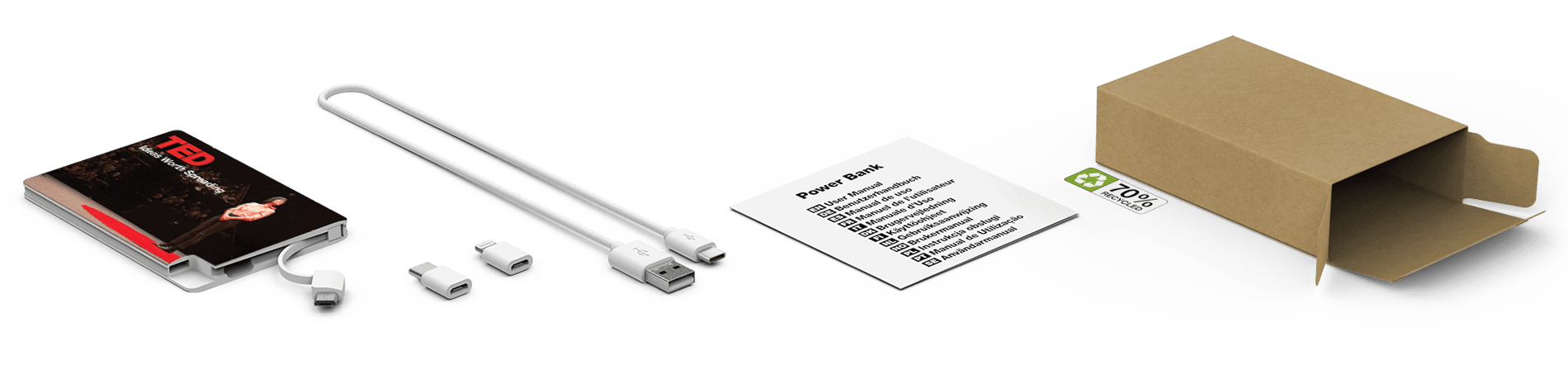 La tarjeta es una pequeña batería que tiene un impacto memorable. Es el obsequio perfecto para un stand de feria o un regalo para un empleado para garantizar que la batería de su teléfono esté completamente cargada y lista para las llamadas y reuniones importantes. Con un cable micro-USB con adaptadores Lightning y USB-C, el dispositivo es compatible con las principales marcas de dispositivos móviles, desde teléfonos hasta tabletas.